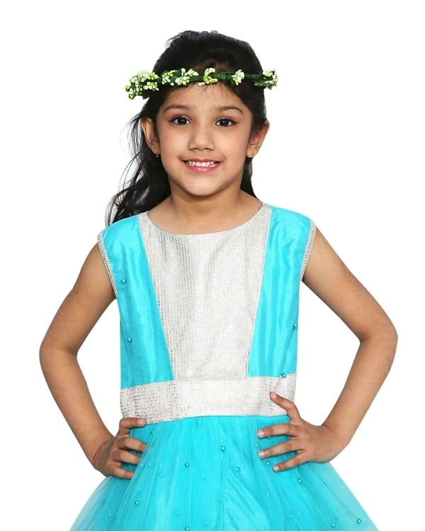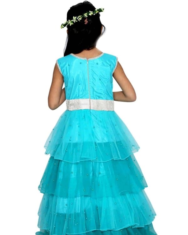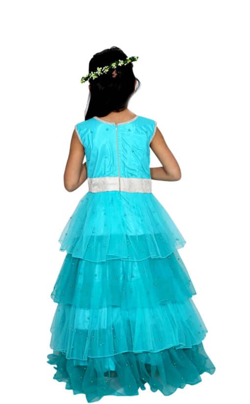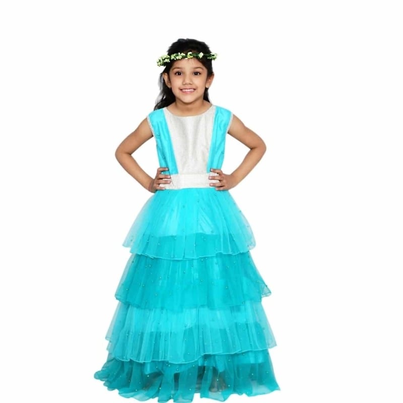 Buy online the in India the simple and elegant long tiered ruffle gown for your Toddler baby girl. This designer sleeveless multi-layered bead studded gown. This exclusive wedding party wear tiered ruffle dress is a blend of fashion and style for your little glamorous girl in the most exquisite way. Our sizes range from toddler and children all the way up to girls/teens size 1 to 15 years.