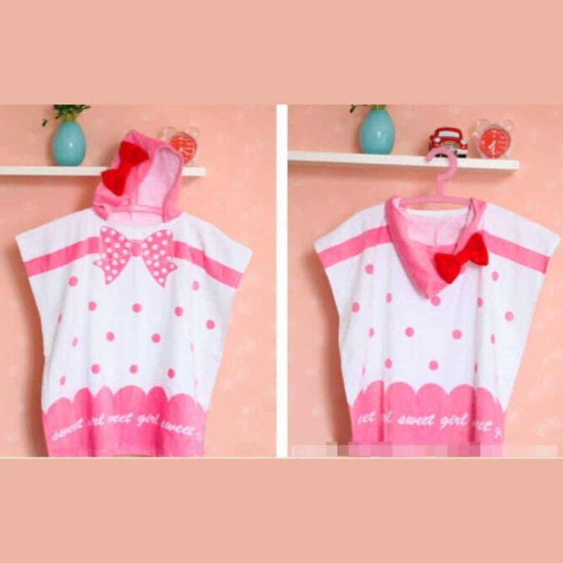 Shop online in India the cool and comfortable bath towel for children. This white and pink colored baby hooded bathrobe comes with a cute hood with red colored bow attached with it making it a perfect choice of baby hooded spa robes for kids. This is a must have fun-filled bath accessory for your cute little baby.