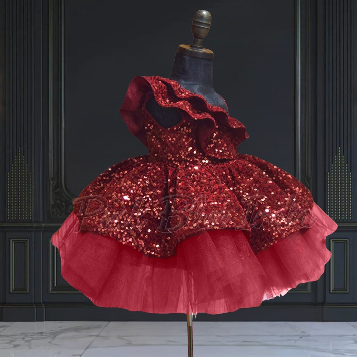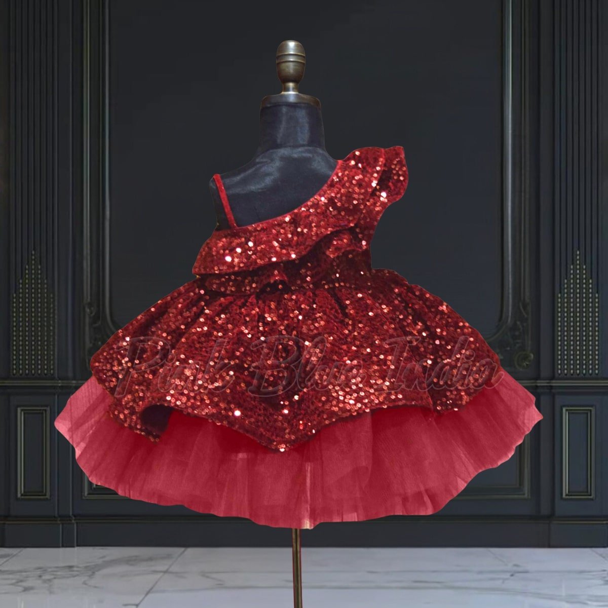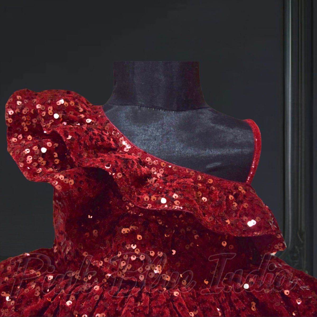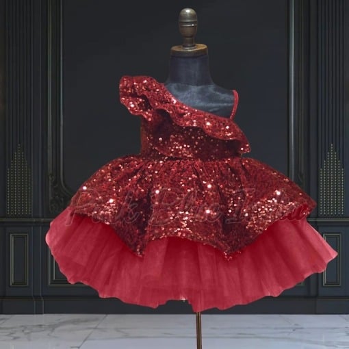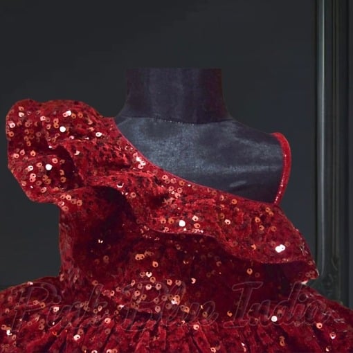 Have her shine like a star at every birthday and wedding this season with one shoulder ruffled frock. This velvet sequins frock in maroon color makes a resplendent party wear frock for baby girls in India. Designed for girls of age 6 months to 12 years, it makes a fashionable designer frock to buy at PinkBlueIndia for special occasions.