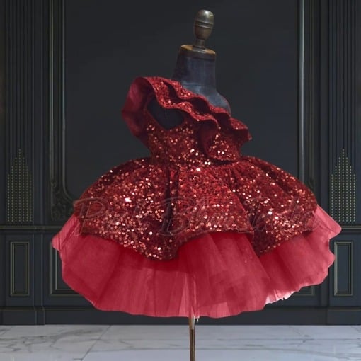 Highly recommended for special occasions. 6 Months to 12 Years Maroon Ruffled One Shoulder Girls Dress