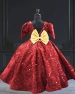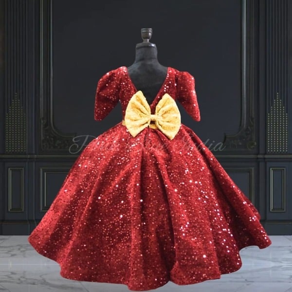 Buy Online Stunning Designer Party Wear Maroon Sequins Ball Gown, big golden bow with Matching Headband. Perfect for Wedding and Birthday.