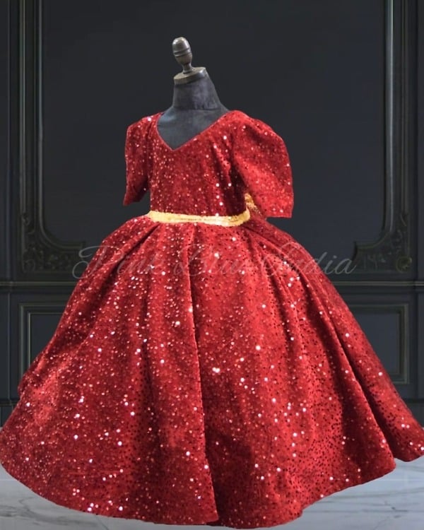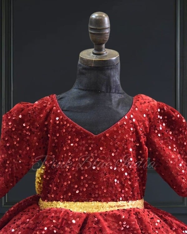 Wonderful design and vibrant colors. Maroon Sequins Ball Gown Girls Party Wear