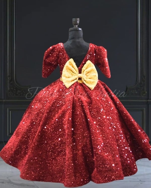 Buy Online Stunning Designer Party Wear Maroon Sequins Ball Gown, big golden bow with Matching Headband. Perfect for Wedding and Birthday.