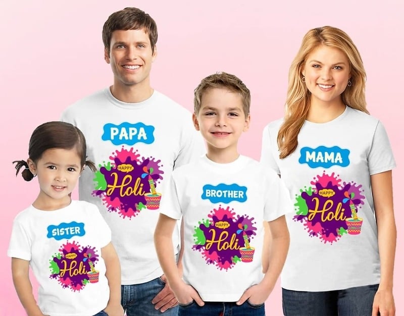 Holi is the most fun day of the year and you can make it an unforgettable day with your loved ones with matching Holi t-shirt sets. Dress like a perfect family bonded with love with these unique matching t shirts for Holi. Go for this custom Holi t-shirts for Father, Mother, Family, Best friends, Couple, Brother & Sister, Siblings, kids, Baby Girl, Boy, Men and Women to dress in synch with each other. Add to cart this matching Holi t-shirt set to add a special touch to this special festive occasion. Made with 100% cotton, these Holi festival printed combo t-shirts are going to make the Holi celebrations so much more fun for everyone.