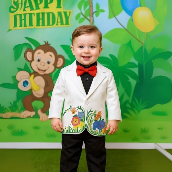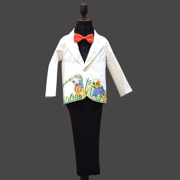 If it is a jungle themed party then what’s better than this unique coat suit made using Raymond’s TR fabric. This white colored coat with jungle themed embroidery is paired with black shirt and pants and also includes a bowtie. Have baby boys of age 6 months to 12 years dressed handsome and stylish in this unique and vibrant coat suit for birthdays and parties.