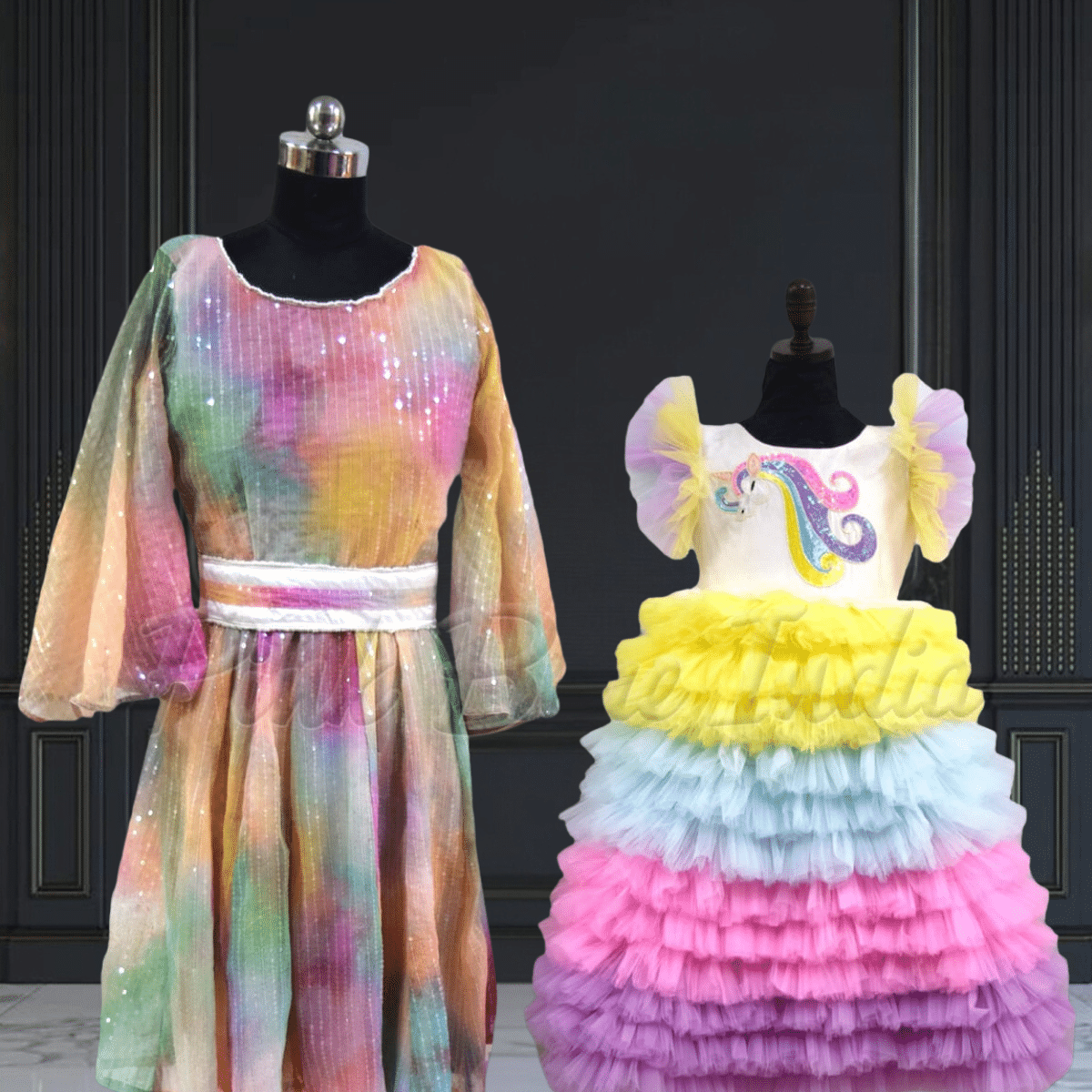 Shop Unicorn theme Knee length dress for Mom and ankle length gown for baby girl with hand embroidered unicorn on the yoke. Perfect for Unicorn theme birthday party.