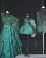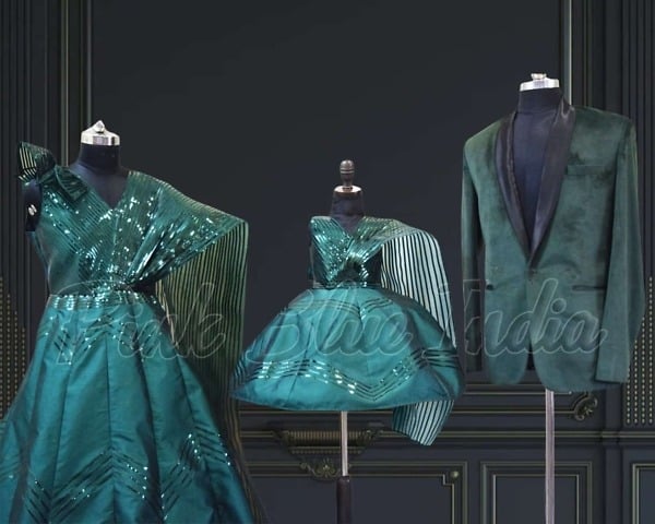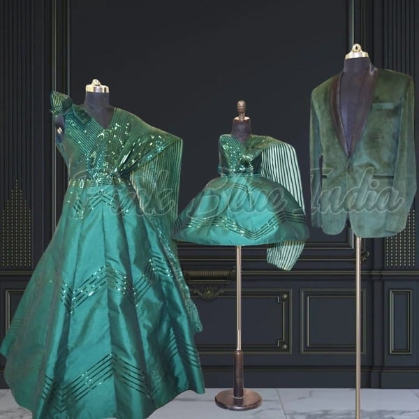 Did we hear matching party wear outfits for Family? Shop this stunning combo in green for Baby, Mother and Father. The combo comprises of ball gowns for Mother and Daughter, and a Tuxedo blazer for the Father.