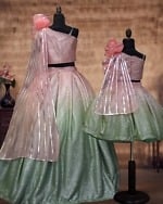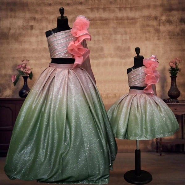 Stunning Mother and Daughter Matching Crop Top with Skirt Set. Perfect Trendy peach, green Color Crop Top Skirt Set for Indian weddings and family function.