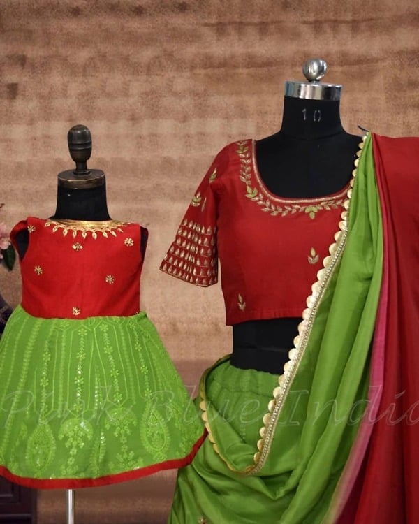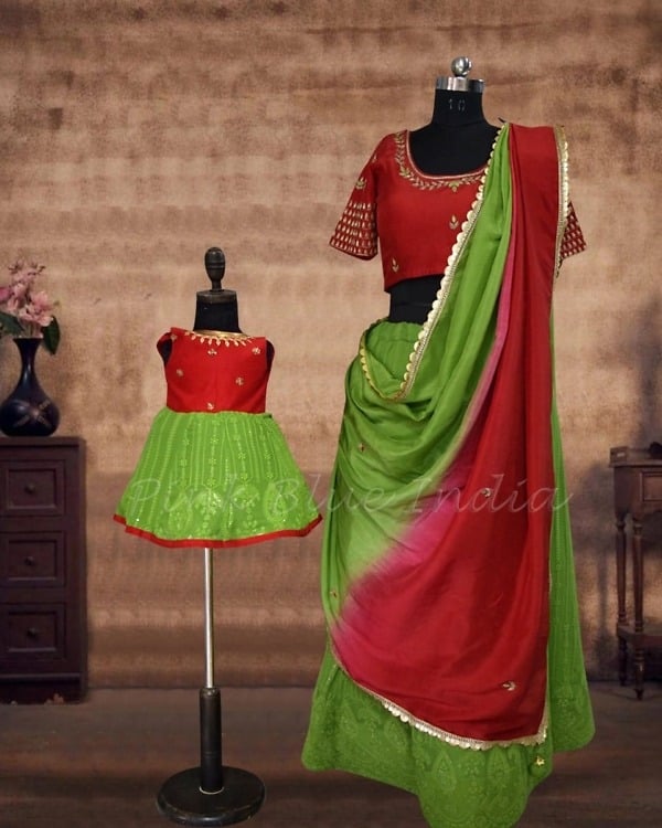 Shop beautiful red and green georgette lehengas with dupattas for mothers and daughters. Perfect for weddings and parties.