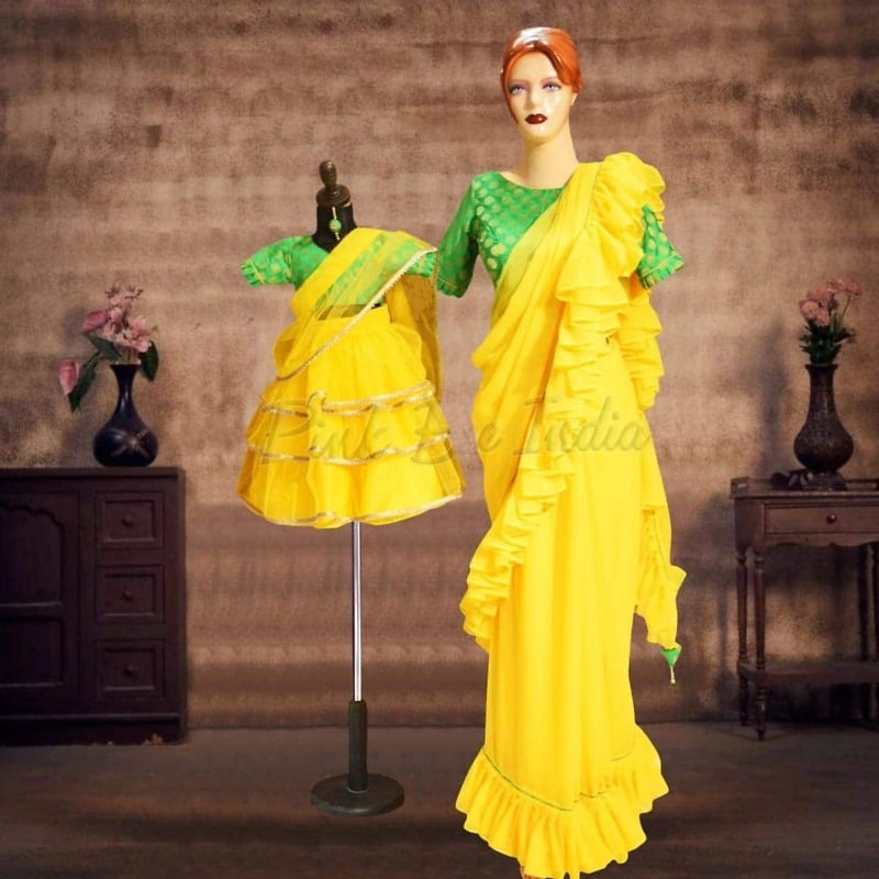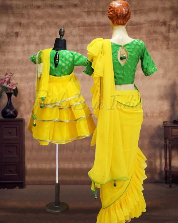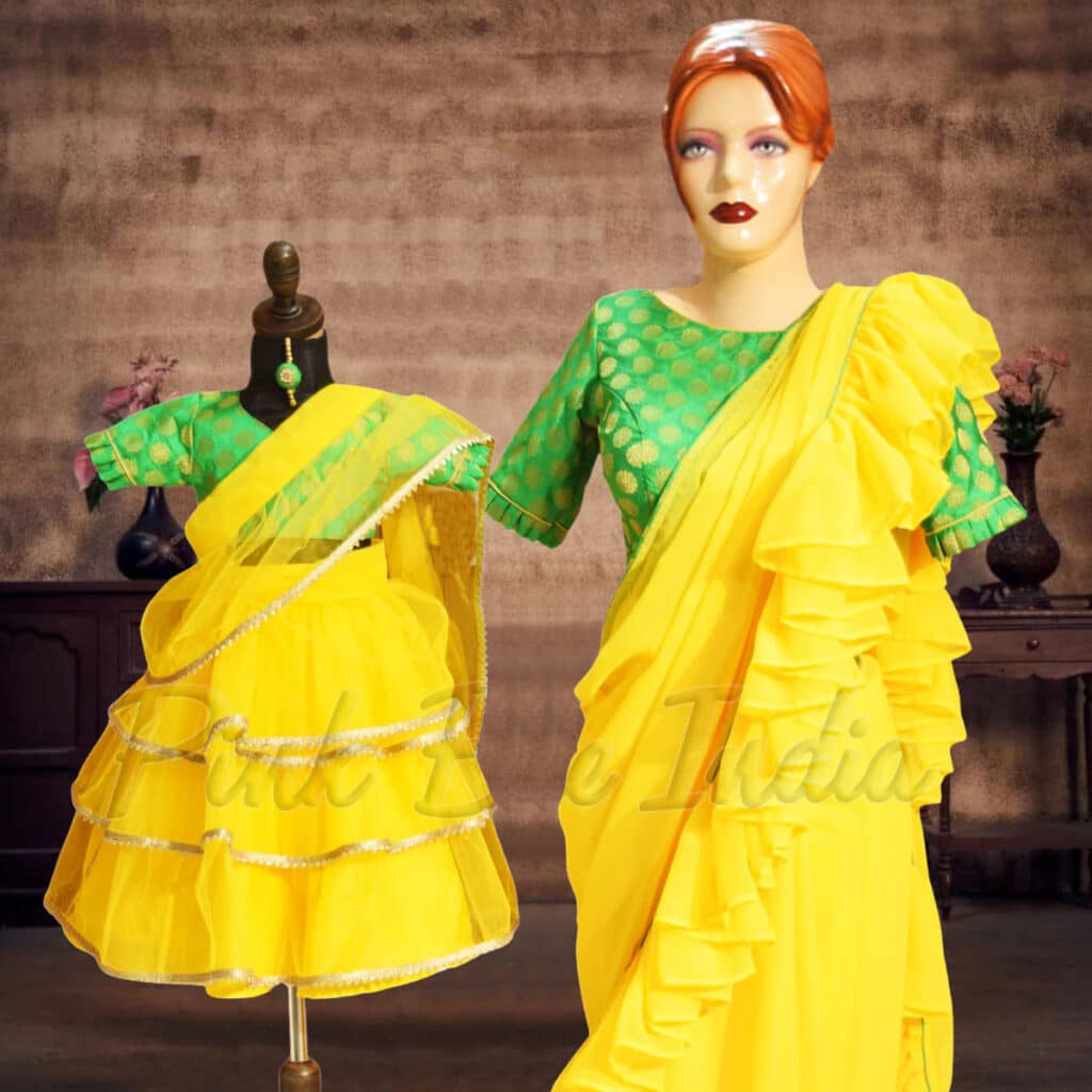 Exceptionally gorgeous mother daughter matching lehenga in net and georgette makes a perfect outfit to dress for weddings and festivals. Shop for mother daughter twinning lehenga set online in yellow and green comes with ruffled attached dupatta for the daughter and pre-draped saree for the mother along with matching hair clip or band. Go with this same lehenga available in sizes ranging from 1 to 16 years for the daughter and XS-XXL size for the moms.