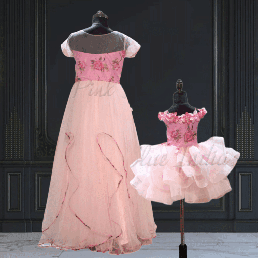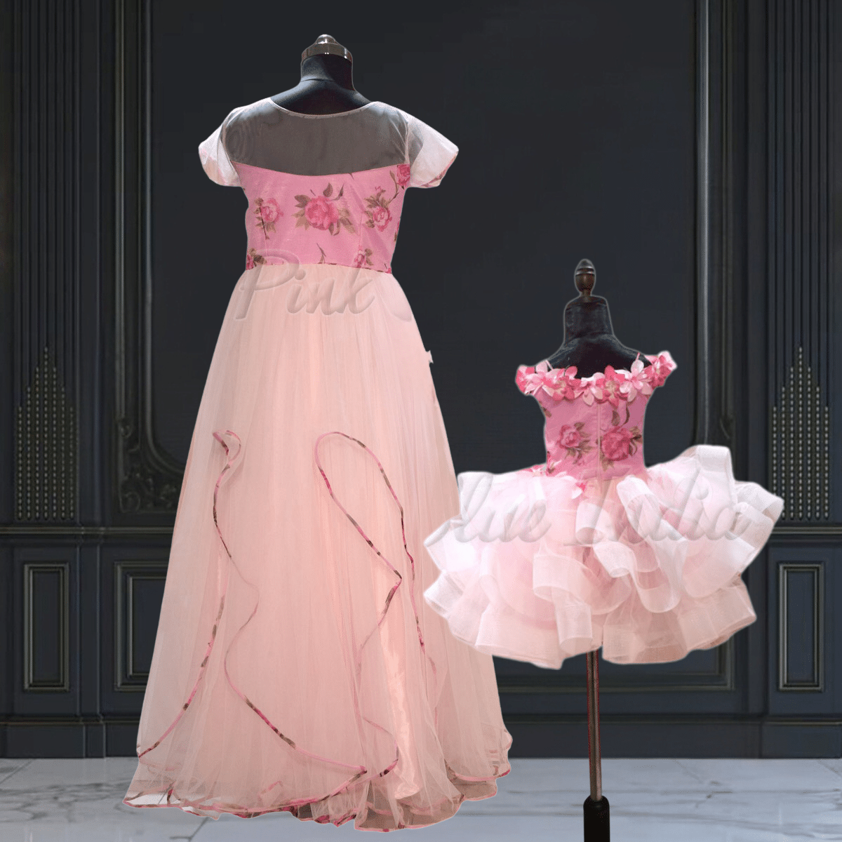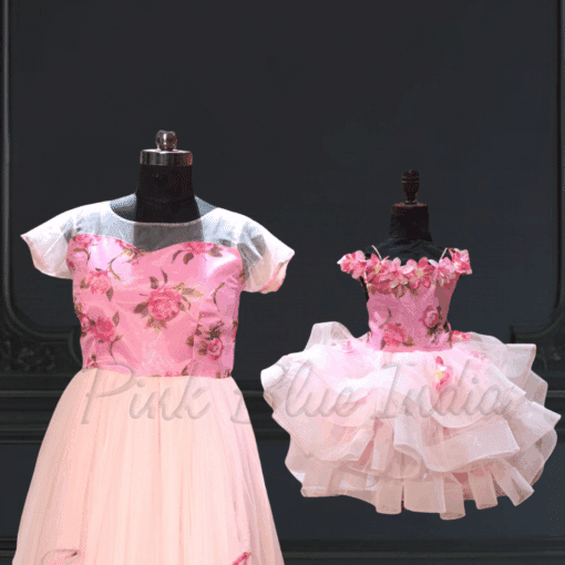 The lovely mother daughter Party Wear gown set in pink with beautiful floral print makes an awesome wear. Designed especially for mother daughter duo is available in wide range of sizes ranging from XS to XXL for moms and 1 to 13 years for boys. Made with premium net, the pink floral off shoulder frock for daughter and stylishly crafted gown for mom makes a complementing outfit to dress for birthday parties, weddings and photo shoots.