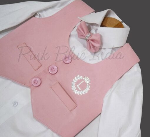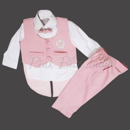 Shop online for the exclusive pink and white dress set for baby boy designed for boys of age 0-6 months, 6-12 months and 1-16 years. A stylish baby boy pink birthday outfit made of cotton with personalized initial name. Dress him up in greatest first birthday outfit comprising of a tail coat, pants and shirt to celebrate his big day in a big way.