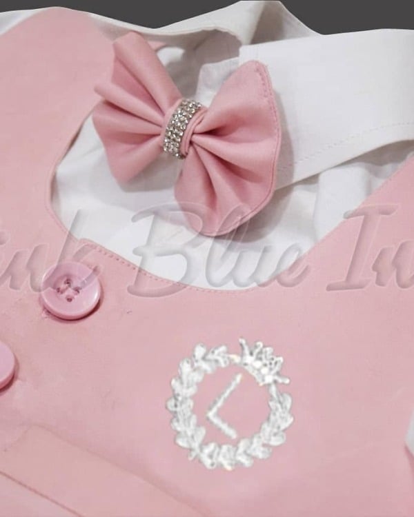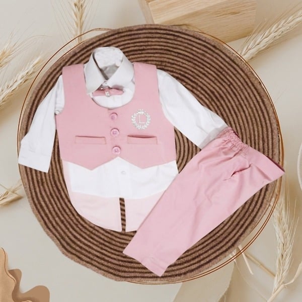 Shop online for the exclusive pink and white dress set for baby boy designed for boys of age 0-6 months, 6-12 months and 1-16 years. A stylish baby boy pink birthday outfit made of cotton with personalized initial name. Dress him up in greatest first birthday outfit comprising of a tail coat, pants and shirt to celebrate his big day in a big way.