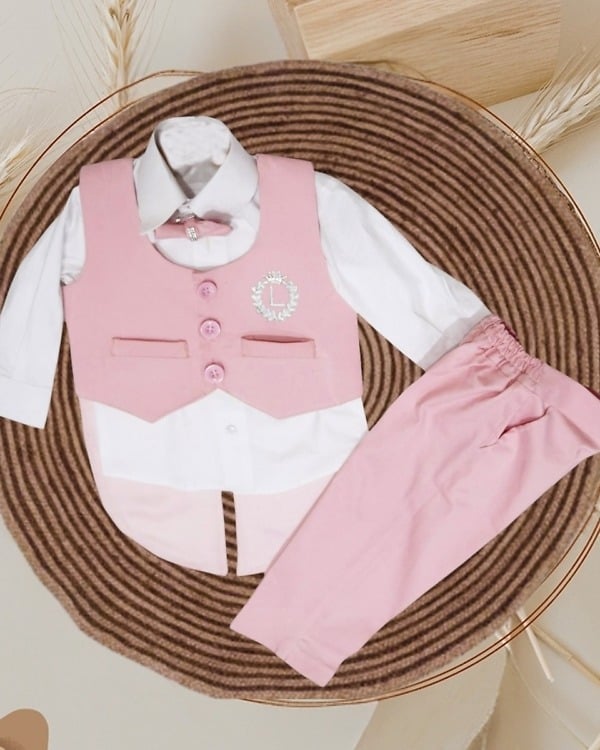 Shop online for the exclusive pink and white dress set for baby boy designed for boys of age 0-6 months, 6-12 months and 1-16 years. A stylish baby boy pink birthday outfit made of cotton with personalized initial name. Dress him up in greatest first birthday outfit comprising of a tail coat, pants and shirt to celebrate his big day in a big way.