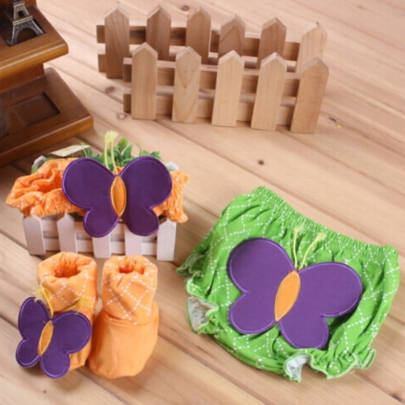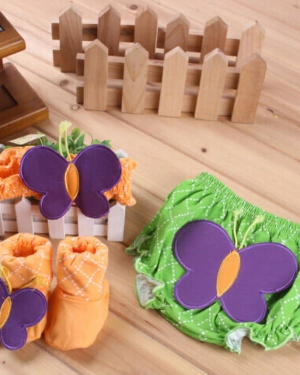 Stylize your cute little baby in the soft and comfortable assortment of 3 piece set. The orange colored toddler shoes and headband truly complement the green colored diaper cover. They all come with purple butterflies motifs for a beautiful look. Shop online in India this check patterned set to dress your infant with style.