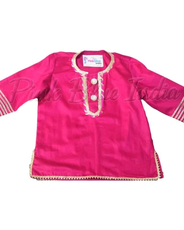 This is a lovely combination of hotpink kurta and pajama set to make sure that your baby girl dresses in a beautiful ethnic wear for festive occasions as well as wedding functions. This cotton silk kurta pajama makes an ideal pick for 6 months to 12 year old girls and has gotta finishing on the neckline, sleeve ends and hem to add a fantastic spark to this traditional outfit.