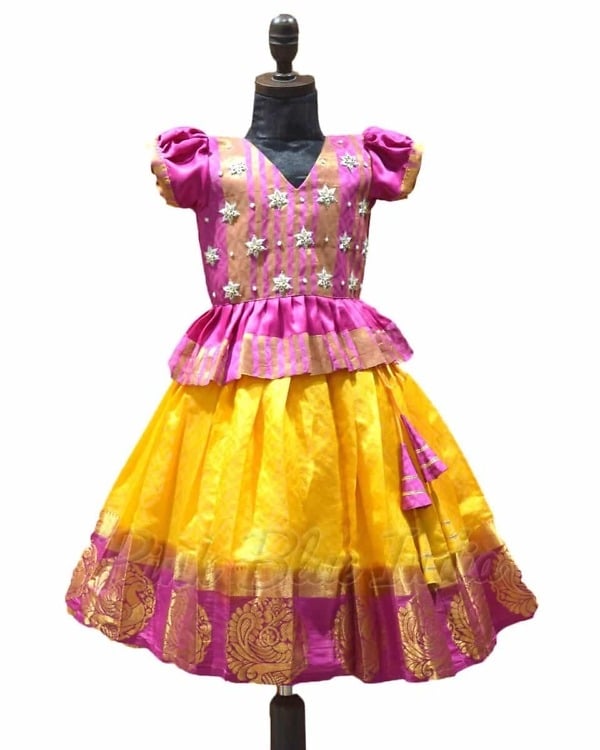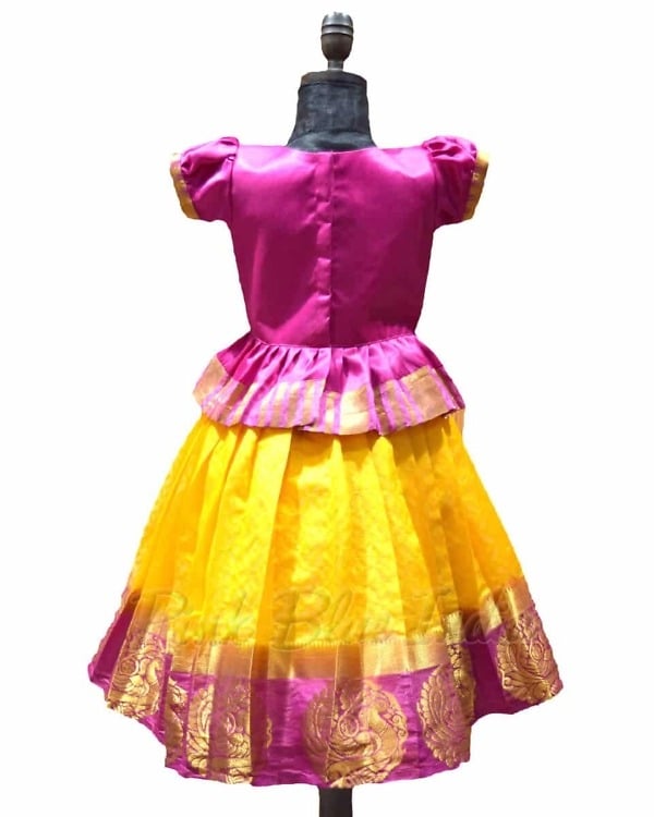 Celebrate the festive occasions and weddings in this gorgeous traditional Pattu Pavadai dress for girl designed in pink color. Shop silk Pattu Pavadai online in India with a peplum styled top with puffed sleeves and a beautiful skirt in a combination of pink and yellow. The hanging tassels on the side add on to the look of this lovely Pattu Pavadai for girls of age 1 to 12 years of age.