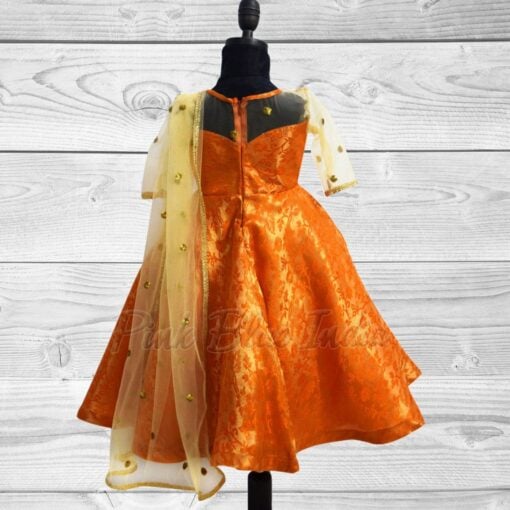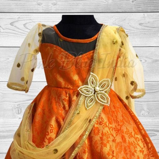 Made with lots of love, this is an incredible Pattu Pavadai dress for baby girls between 1 and 12 years of age. Shop online this graceful Indian infant ethnic wear which is a perfect pick for Annaprashan, wedding, naming ceremonies. Made with Banarasi silk and net, this full sleeve gown in orange and gold comes with a pre-stitched dupatta. There is a lovely floral motif on the waist. This wonderful piece of art comes with a matching hair accessory to complete her look.