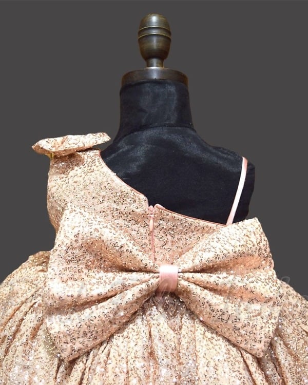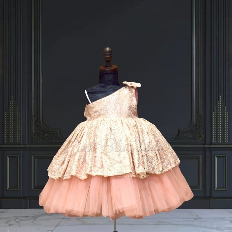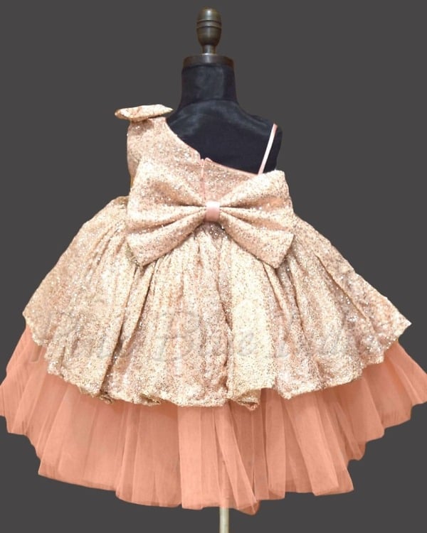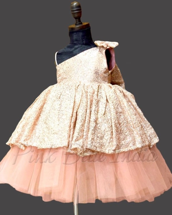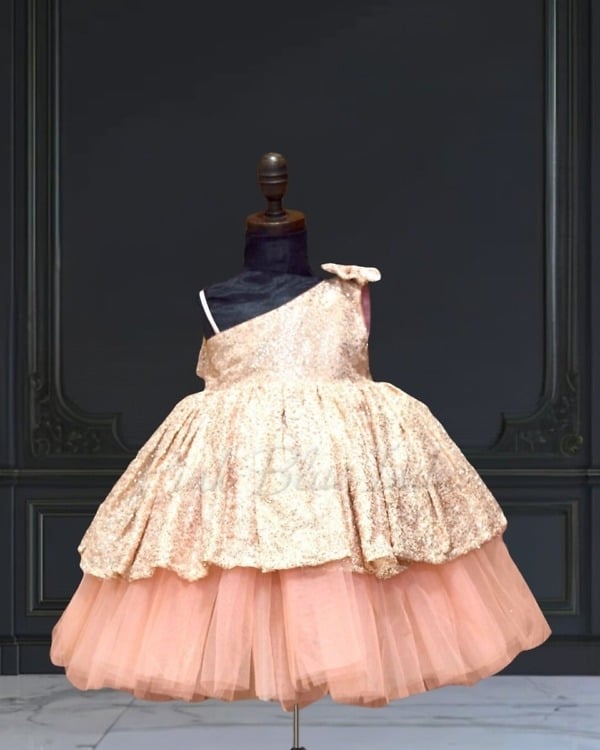 Designed especially to make birthdays and weddings more fashionable for her, this sequins layered gown in peach color makes a gorgeous wear. Made using sequins and net, this stylish party wear gown is a one shoulder design with a sleek strap on the other side. Having grace and glamour, this makes an exceptional outfit for girls between 1 to 12 years of age.