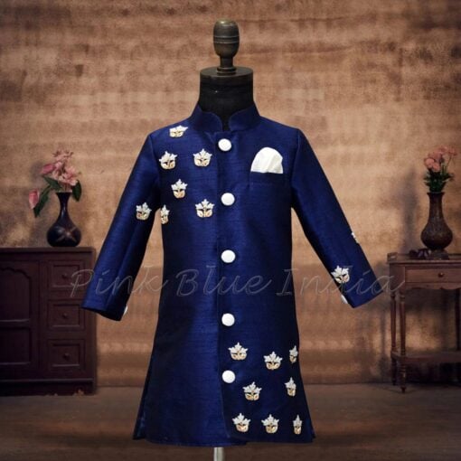 Dress your baby boy in this stunning blue sherwani with pearl work, perfect for Indian weddings and special events. Elegant, comfortable, and stylish.