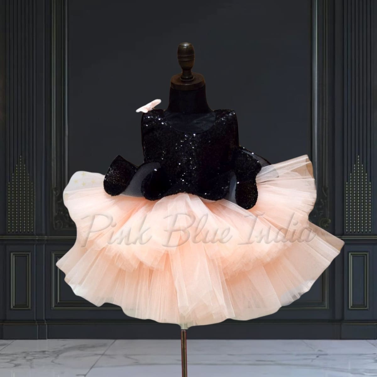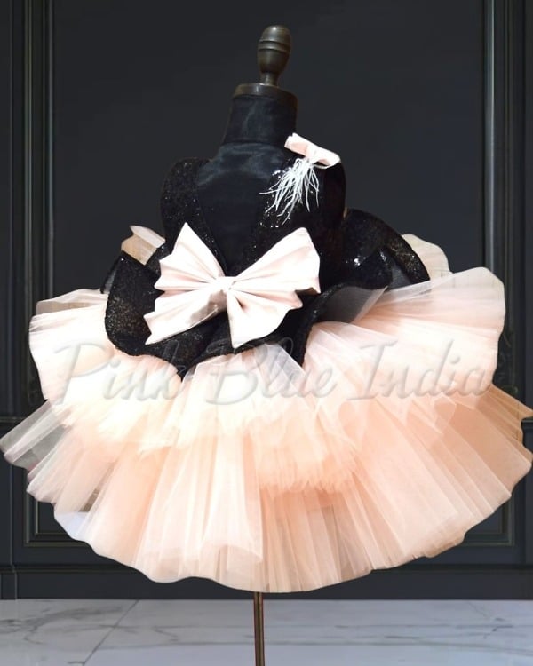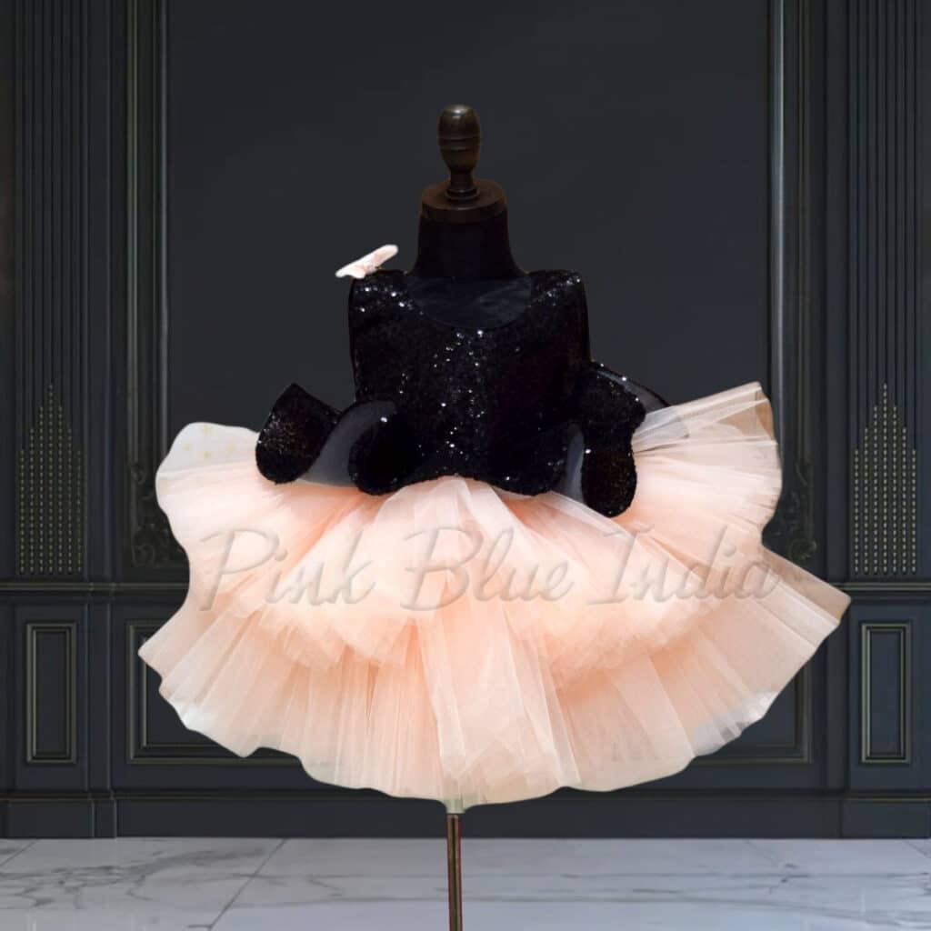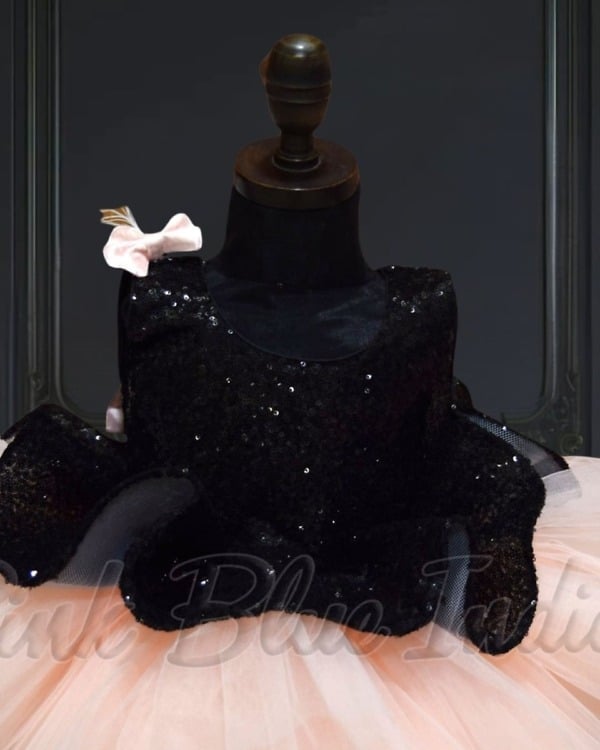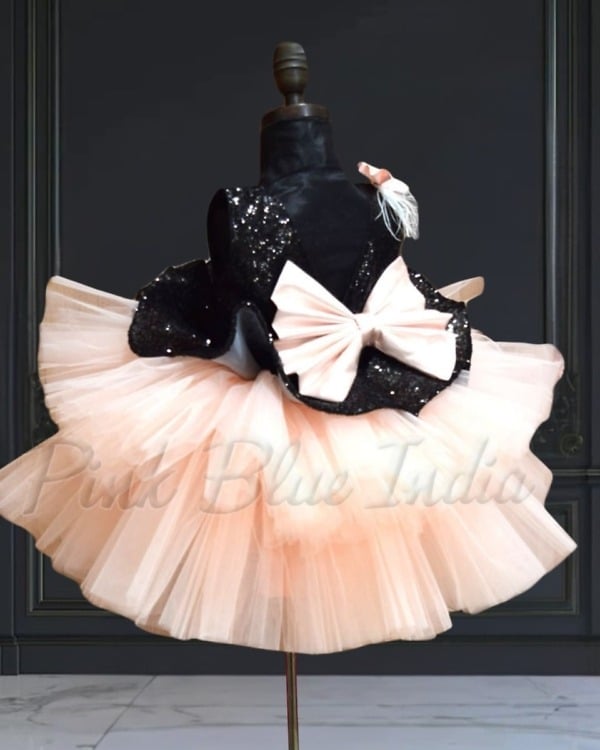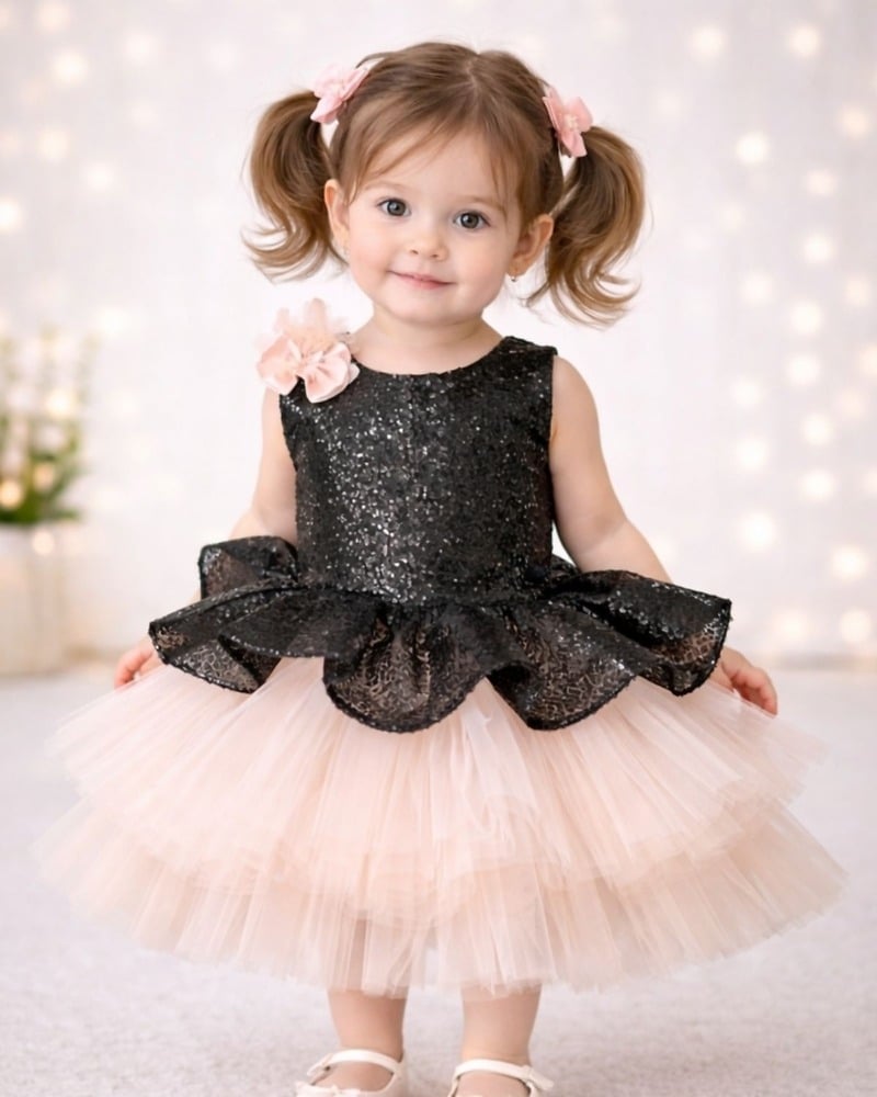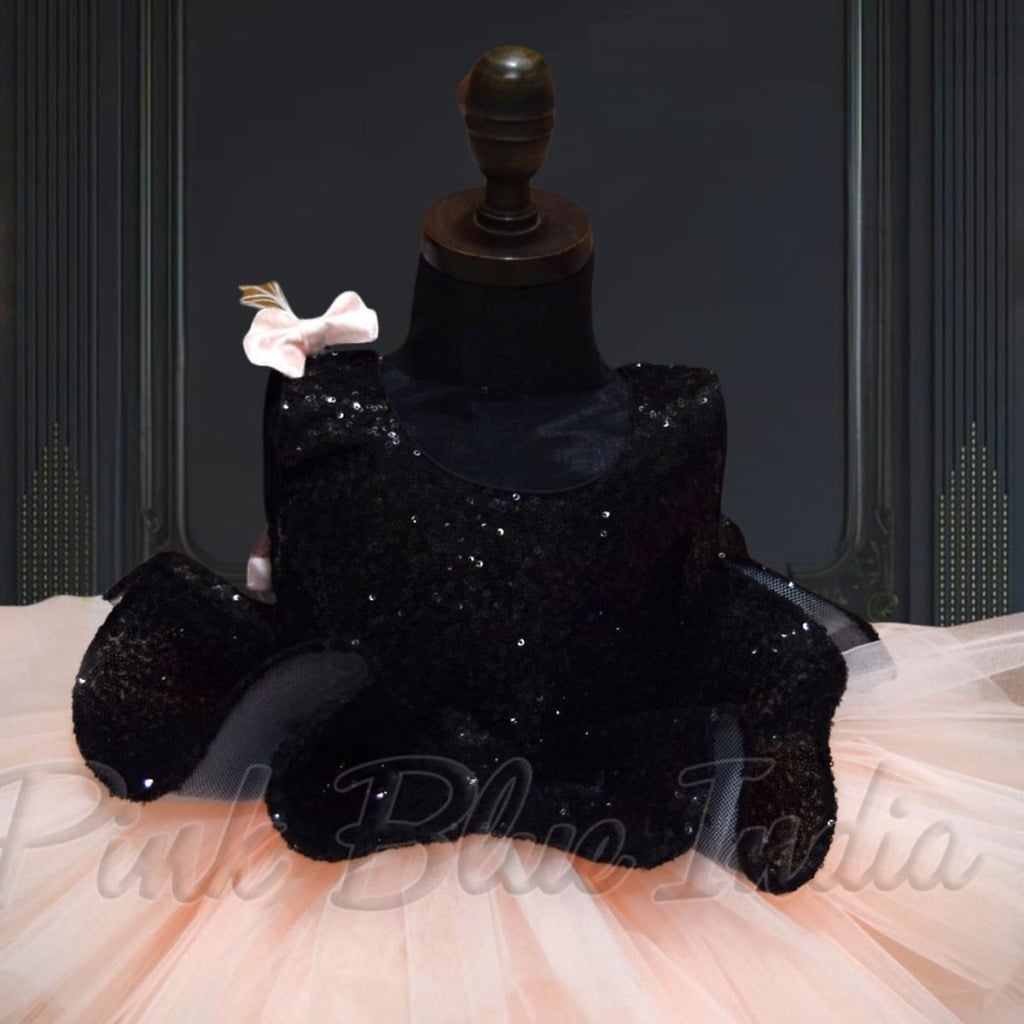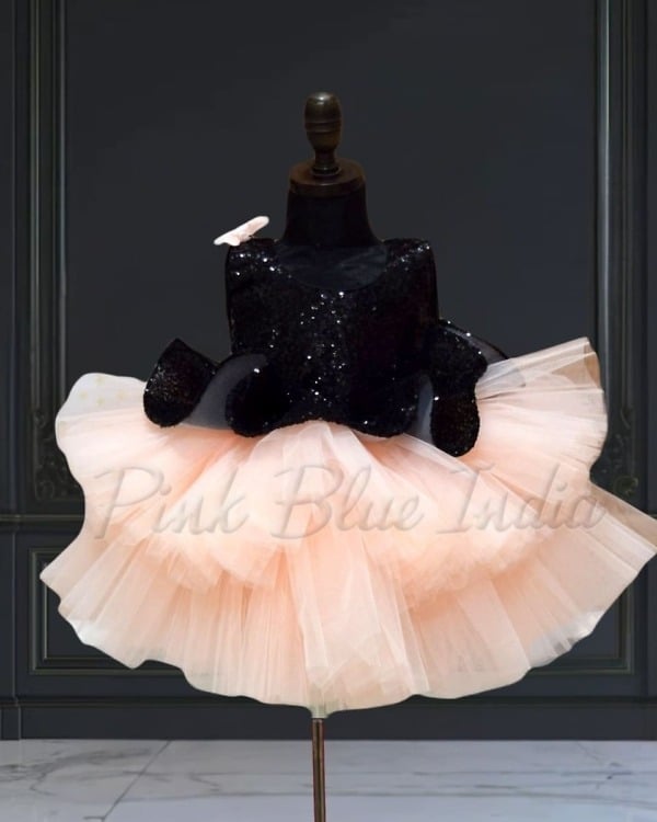 Elegant peplum party frock designed with a sequins black bodice and soft layered peach net flare. This fashionable outfit is ideal for birthdays, celebrations, photoshoots, and festive occasions. Crafted for comfort and style, it creates a graceful party look. A matching hair accessory is included to complete the outfit.