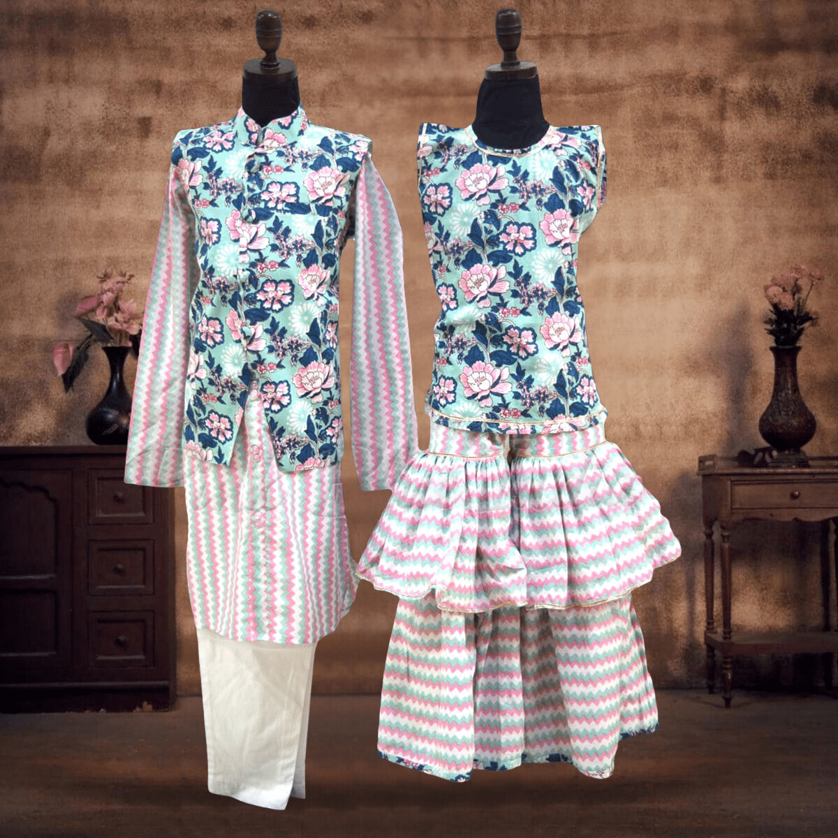 Whether it is the festival of Raksha Bandhan or a celebration of any of the wedding functions, have the siblings dressed in this cotton crafted pink colored clothing. Designed for kids between the age bracket of 0-6 months to 12 years, this sibling combo includes a pair of kurta pajama and jacket for the brothers and a beautiful kurta and sharara for the sisters to make sure that both the siblings coordinate in great style.