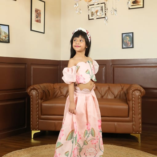 Elegant pink crop top and skirt set for girls, perfect for weddings, special events and festive functions. Lightweight, premium design with beautiful detailing.