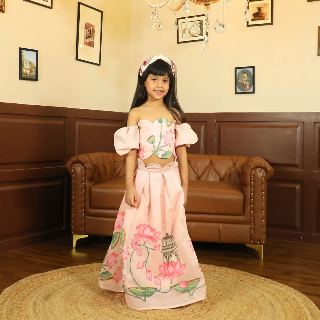 Elegant pink crop top and skirt set for girls, perfect for weddings, special events and festive functions. Lightweight, premium design with beautiful detailing.