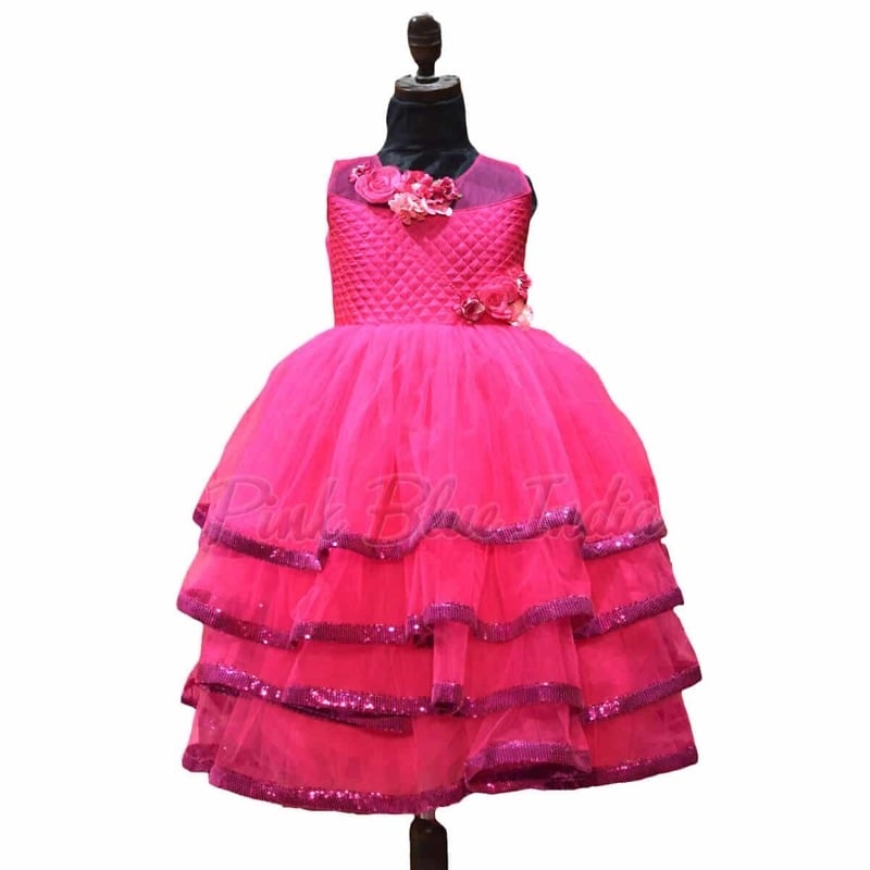 She is going to look the prettiest dressed in this pink colored layered gown from PinkBlueIndia. Designed with perfection, this flower layered party gown makes a cute outfit to dress for birthdays and weddings. The beautiful floral arrangement on the sleeveless yoke adds on to the beauty of this exceptional wear. Shop online for this unique custom layered net dress for 0-6 months to 12 year old girls in India that even makes a pretty pick for photo shoots.