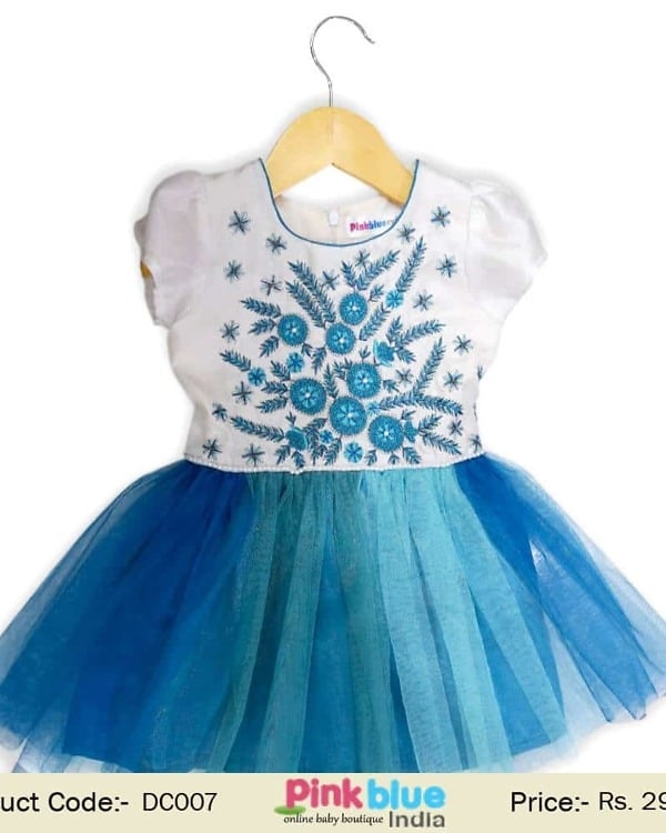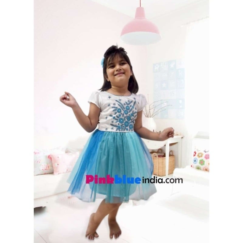 Dress your baby girl in the gorgeous and stylish floral party dress. This wonderful toddler dress comes with an elegant net flare in different shades of blue with pretty white colored bodice consisting of blue colored embroidered flowers and puffed sleeves. It is perfect wedding attire for your little princess. Shop online in India the gorgeous clothing for your baby girl.