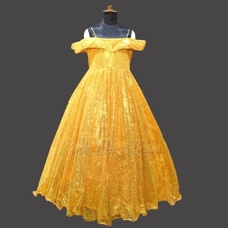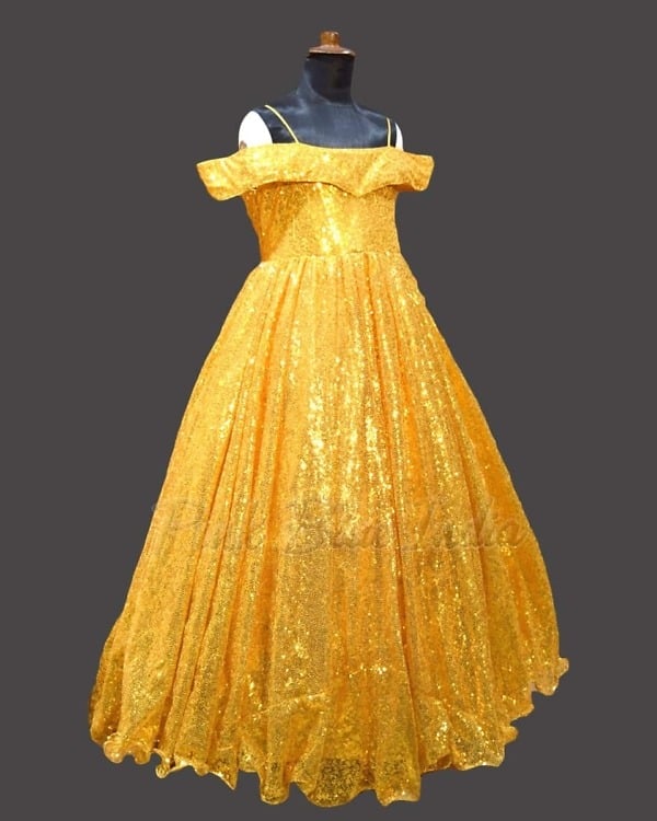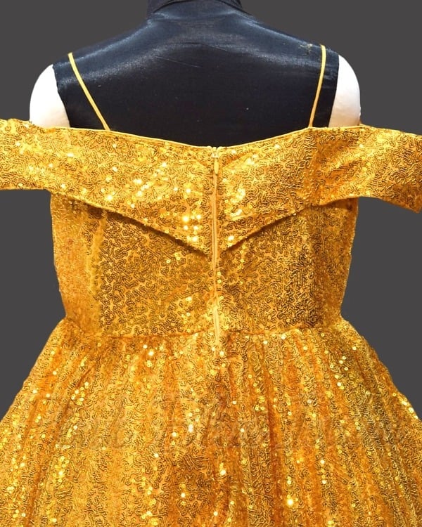 A glamorous and shimmery golden sequins off shoulder gown makes a lovely party wear gown for baby girls of age 6 months to 14 years. This fashionable outfit makes a wonderful outfit for birthdays, weddings and special occasions. It even includes a hair accessory to match the style of this exceptional dress.
