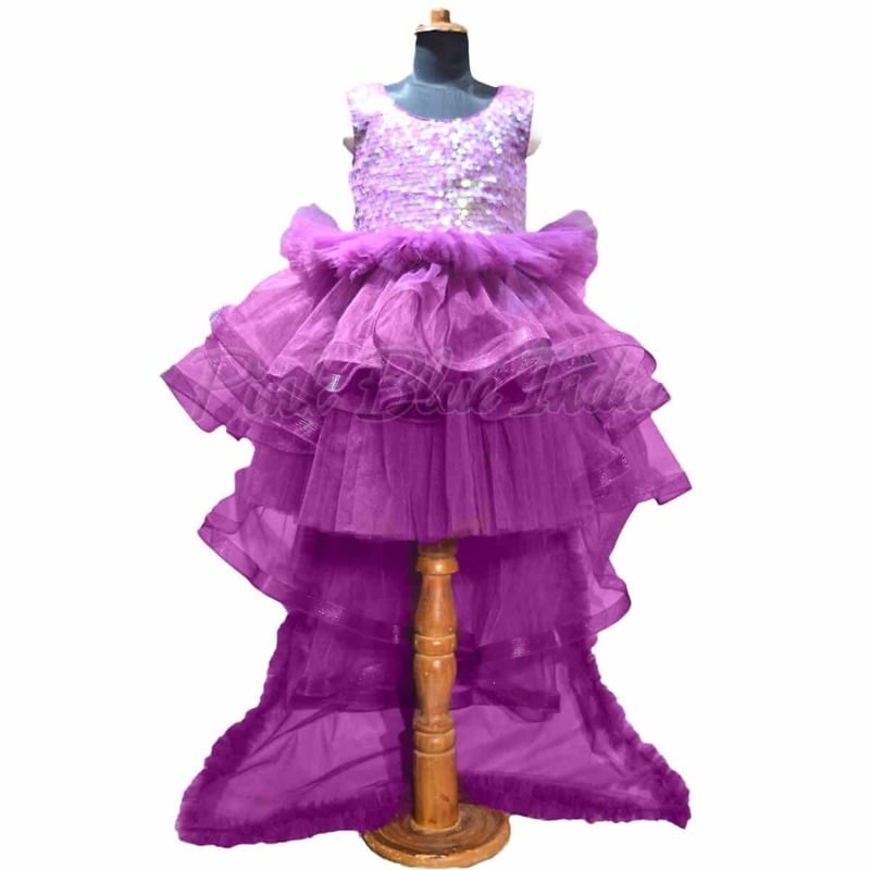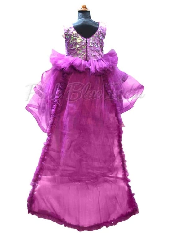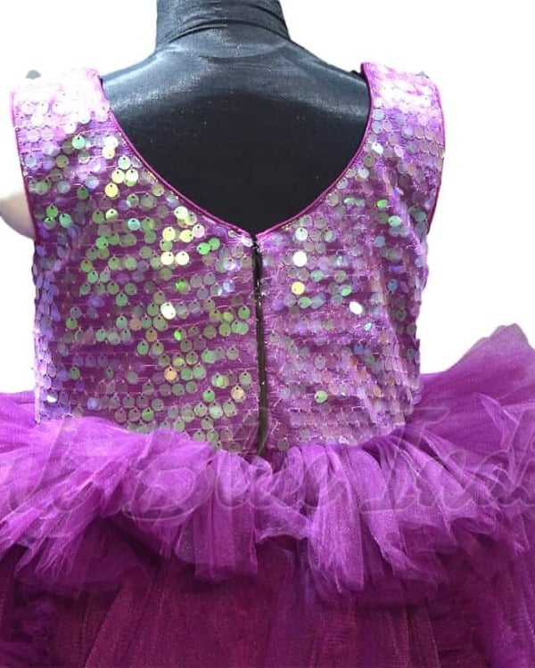 She is going to look nothing less than a princess dressed in this enchanting purple party wear tail gown. It comes with a detachable tail and a gorgeous sparkling sequence yoke that is perfect to spruce up occasions like birthdays and weddings. The lovely flare adds on to the grace of this innovative party wear flower girl dress which is made using net fabric and it comes with a matching headband as well.
