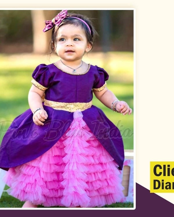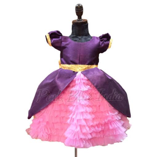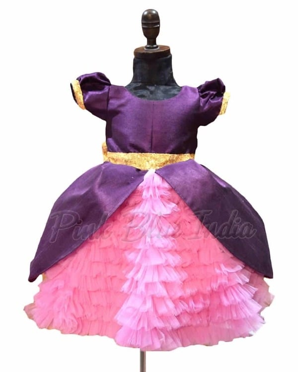 Designed especially for baby girls between the age bracket of 0-6 months and 12 years, this purple and lilac colored layered gown makes a wonderful pick. This net party wear gown makes a suitable purchase to have your little princess dress up for birthdays and weddings in something unique. She is going to look gorgeous dressed in this breathtaking designer party wear gown with beautiful layers. Shop online for this awe-inspiring outfit for your little princess at PinkBlueIndia.