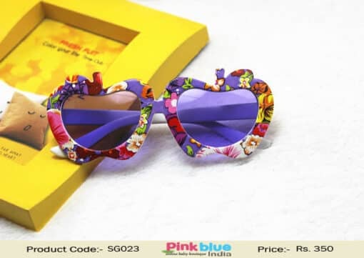 Buy online in India the smart fashionable party glasses for kids and baby at reasonable prices. These children sunglasses come in purple color with apple shaped frame with floral print. These unique fancy colorful baby shades are the best way to accessorize your child and keep his eyes safe from harsh sunrays.