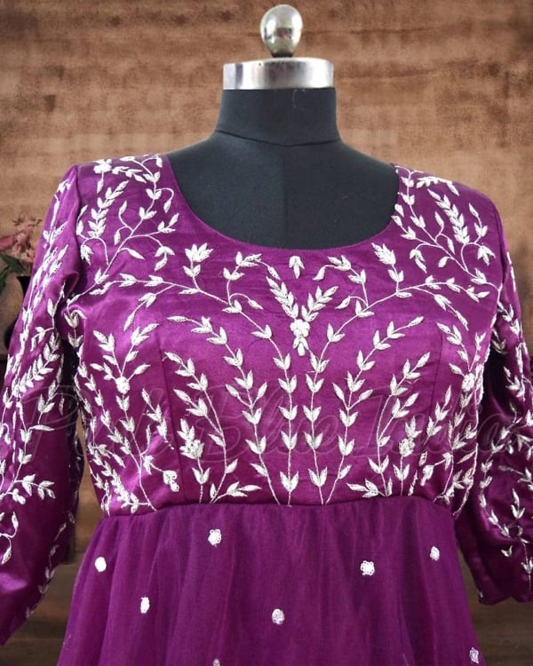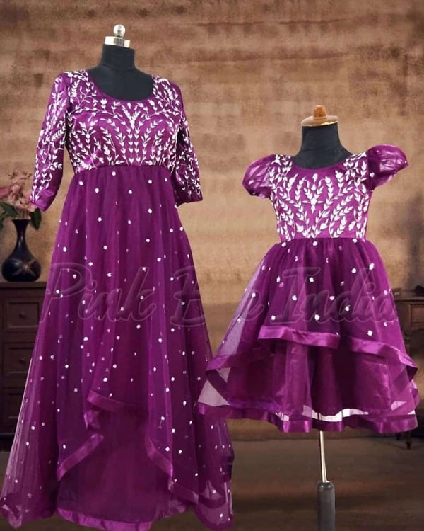 Shop Matching party wear gowns for Baby and Mother in purple colour. These gowns are perfect for special occasions like Birthdays, weddings, festivals or photoshoots.