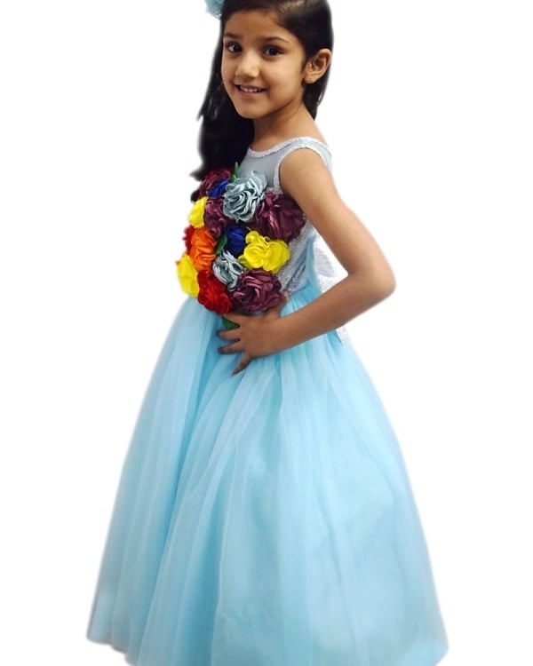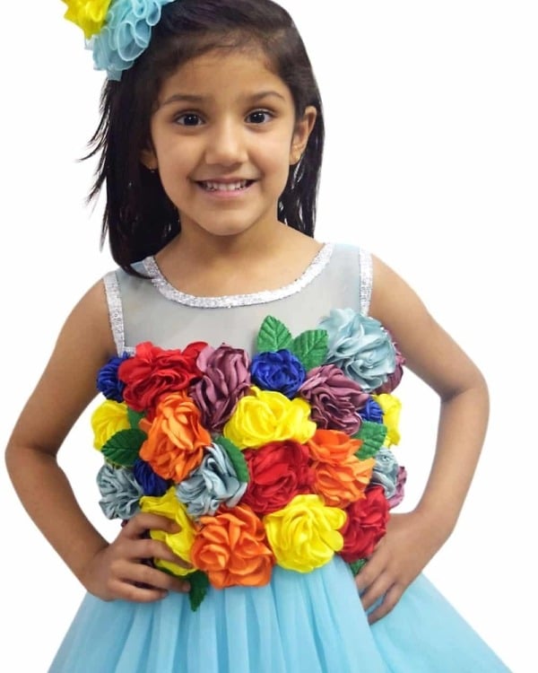 This dress is perfect for rainbow theme party. Dress your daughter in this beautiful vibrant multi-colored 3D flowers. Your little girl will look so cute and sweet in this dress and will be a perfect outfit for party, pictures wedding, birthday parties and pageant.