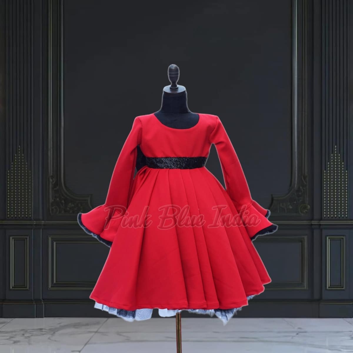 Have her rock and roll in this red Minnie Mouse birthday dress. Designed using neoprene and net, this pleated dress makes a perfect theme party dress. Long sleeves with black shimmery net on the hem and black shimmery belt on the waist make this Minnie Mouse baby first birthday dress a very special one. Shop online for Minnie Mouse 1year birthday outfit with a matching hair accessory for your princess. Find this lovely red Disney theme party outfit for 6 months to 15 years old baby girls.
