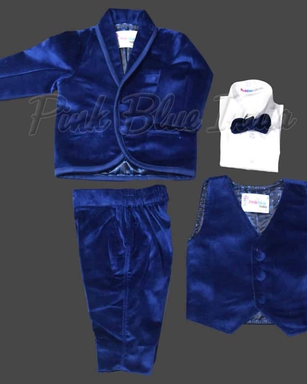 All you need is a royal blue colored coat suit in velvet to have your baby boy dressed in something classy and dapper. This five piece coat suit comprises of a coat, white shirt, waistcoat, pants and bowtie to make sure that your little prince is ready for any birthday party or wedding celebrations. This luxury wear is an ideal pick for boys of age 6 months to 12 years of age.