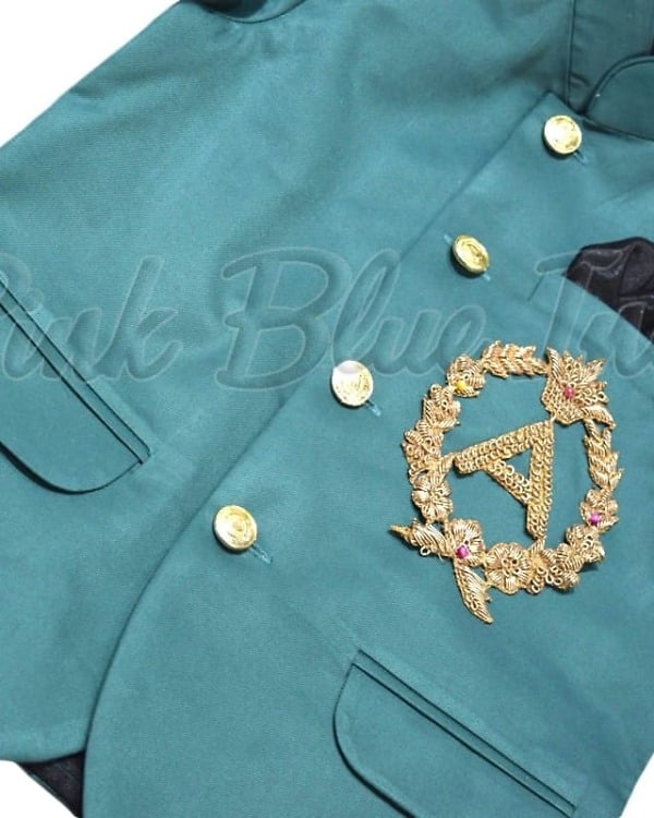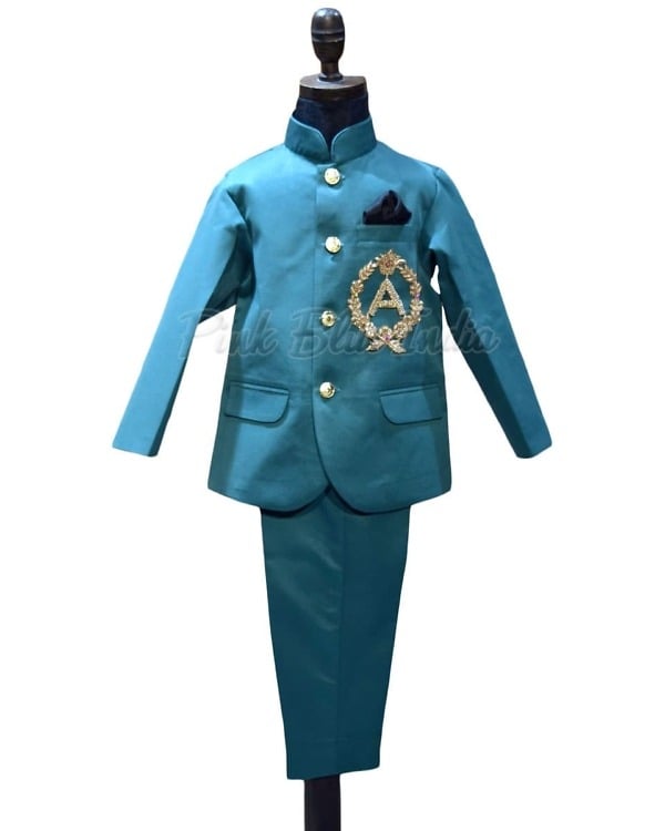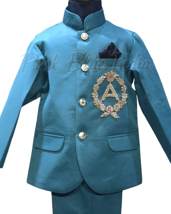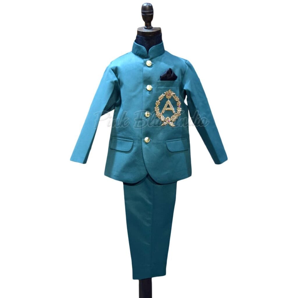 A formal Jodhpuri set in green color makes a perfect ensemble for formal parties and weddings. This teal green colored suit with personalized name initials embroidered with finish has been designed using Raymond’s TR fabric. Shop online at PinkBlueIndia this classy formal suit for baby boys in India falling between the age brackets of 6 months to 12 years.