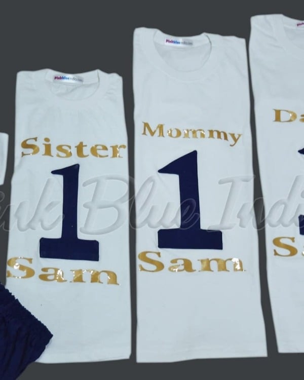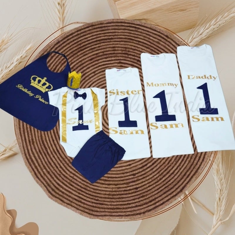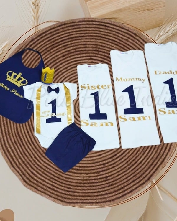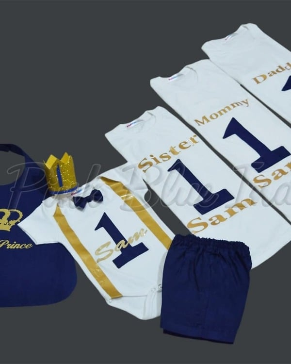 This is a beautiful royal prince family matching outfit set designed for complete family. This royal family t-shirt set consists of white cotton t-shits for sister, mommy and daddy along with a bodysuit, pants and blue apron for the birthday prince. An exceptional king queen prince family shirt set that is a personalized birthday dress set for a family of four and for boys of age 1 to 16 years of age. Designed around little prince theme, this set comes with a matching crown in golden to add a beautiful finishing touch to this combination.