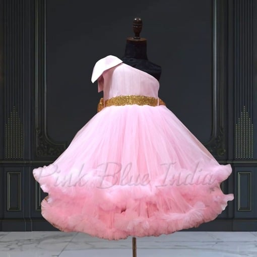 Be it any wedding or birthday party, this exquisite pink coloured one shoulder ruffle gown makes a delightful wear. Dress your little princess in unmatched style with this designer gown made using net. Available in different sizes ranging from 1 to 12 years, it is an exceptionally gorgeous gown to shop for.