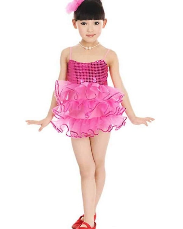 Buy online the in India the shimmery baby kids dancewear costume for young girl. The hot pink attire has a shimmery bodice with spaghetti straps and complimenting net flares. The well fitted attire is made with high quality fabric and makes up a great choice of dress for your little princess. Rock her performance with a hint of glamour. This is a children dance costumes perfect for age group 18-28, 1-2 years, 2-3 years, 3-4 years and 4-5 years.