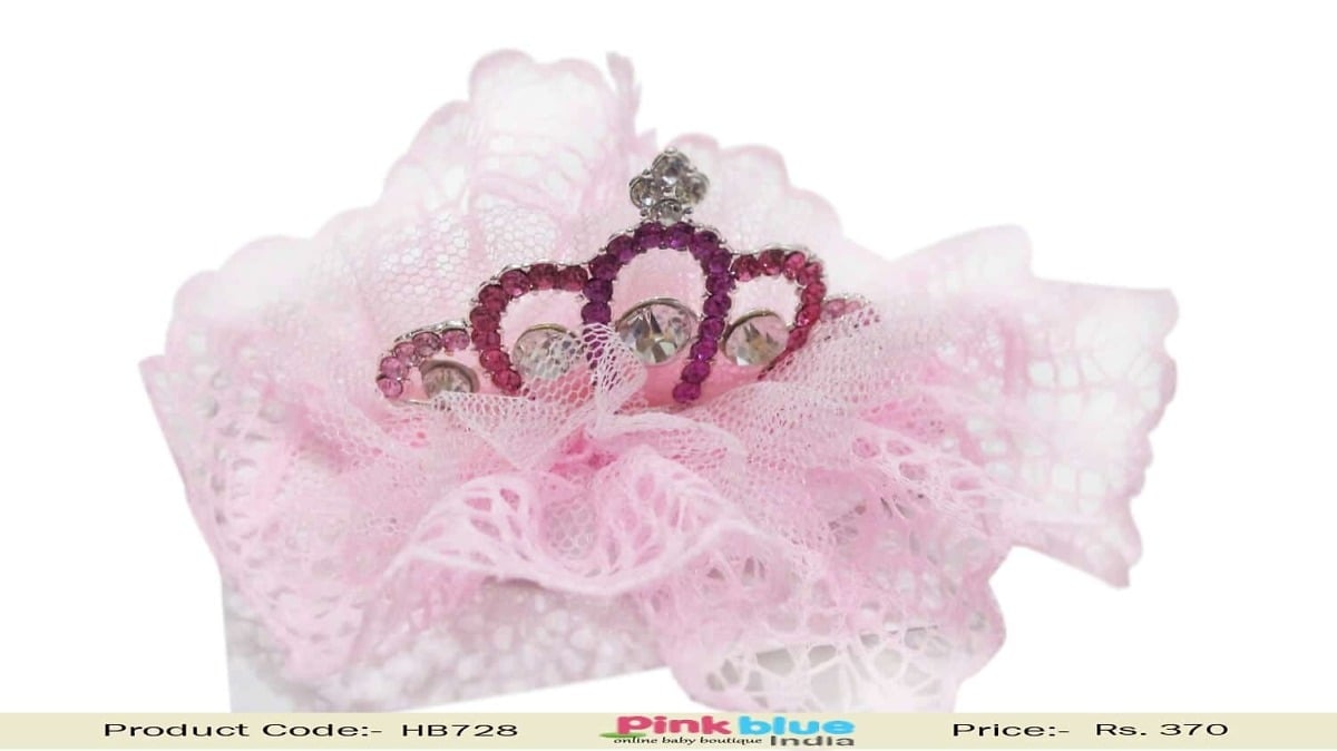 Buy online in India the fabulous and fashionable hair clip in baby pink color. The beautiful crown style hair accessory comes with shimmery pink tiara decorated with diamonds and set on a designer baby pink net. Dress your young baby girl in this trendy and comfortable kids wedding clip for smarter and well manager hair.