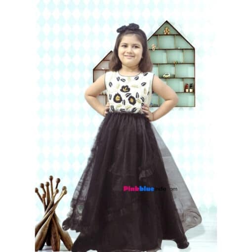 Gift the gorgeous white and black designer luxury party dress to your cute little princess. The sleeveless white bodice comes with floral design with a gorgeous flare in black for a fashionable look. Shop online in India these elegant baby clothes your girl at the best prices and dress her smartly for her special occasions like Diwali, Raksha Bandhan, Ramadan Eid or weddings parties celebrations.