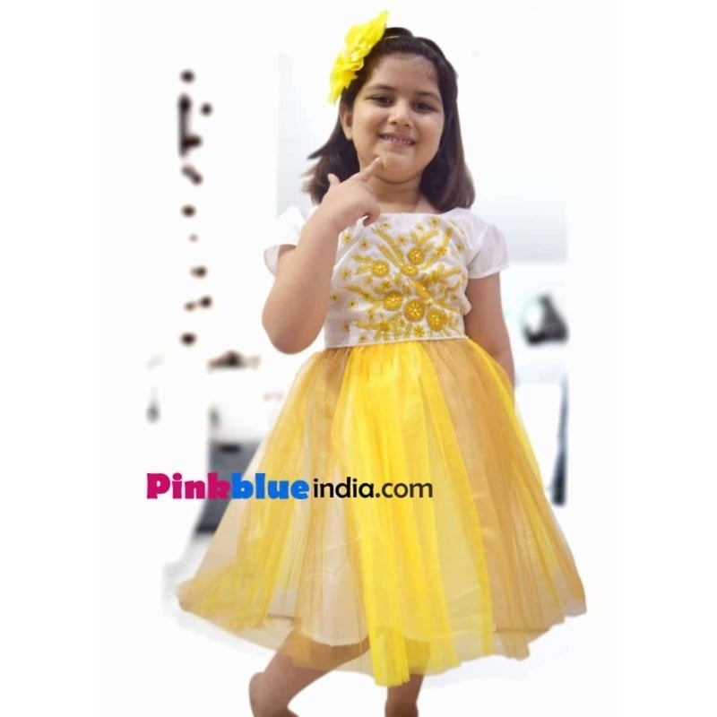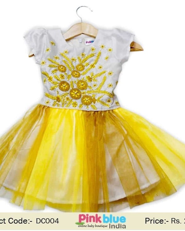 Design a new and stylish party look for your little princess with the elegant and smart party dress for your toddler. It comes with a white bodice consisting of embroidered flowers in yellow and net flare in two shades of yellow on white base. Shop online in India the gorgeous clothing at reasonable rates for summery attire.