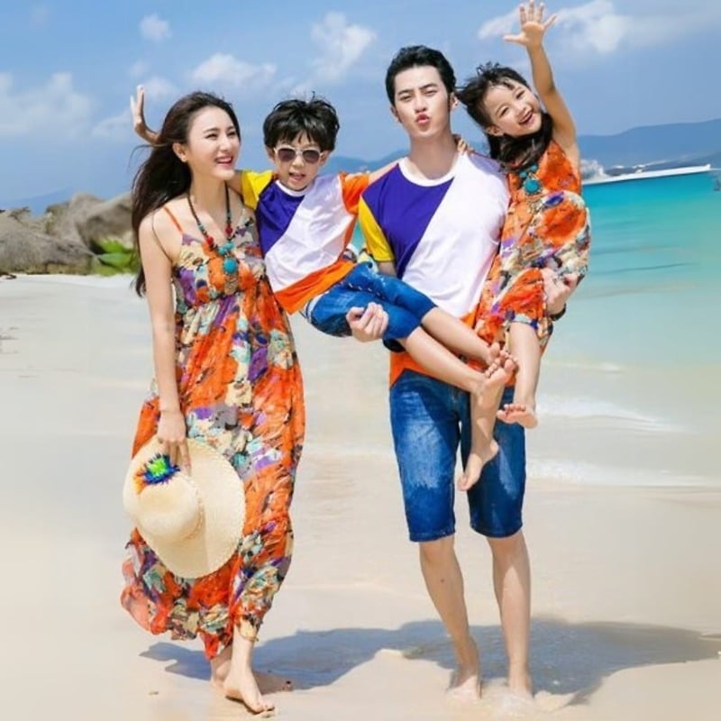 Buy online in India matching family outfits for beach vacations or pictures. Go for the fashionable matching orange dress for mother and daughter with complementing white and blue father and son matching shirts. Give your family a completely new look with these matching outfits for whole family.