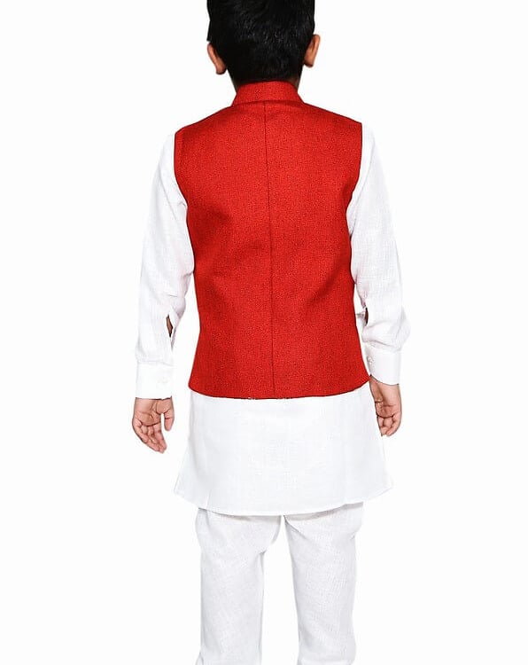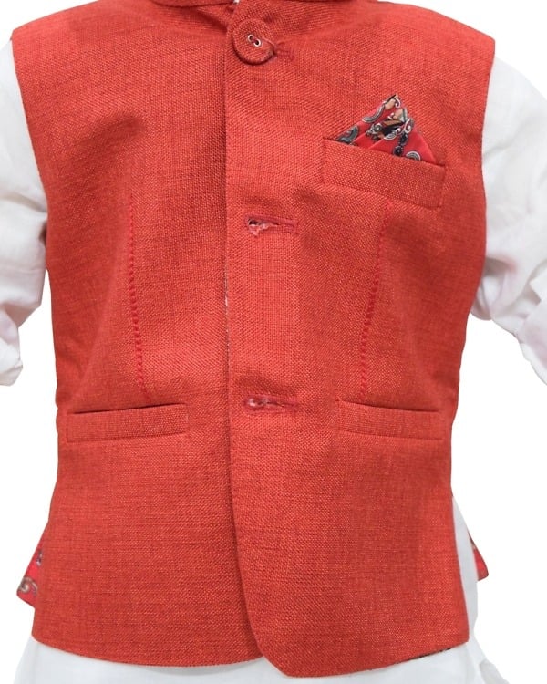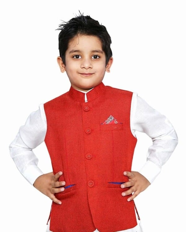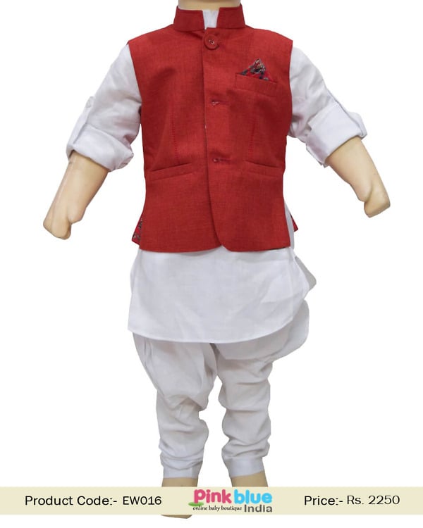 Choose the very simple pair of traditional kurta pyjama set for your baby toddler to dress him in the most beautiful clothes for weddings and festivals. It comes with a smart red jacket. Shop online for this stylish baby ethnic wear in India up for sale at this vivacious online store and make him look stunning for all social gatherings.