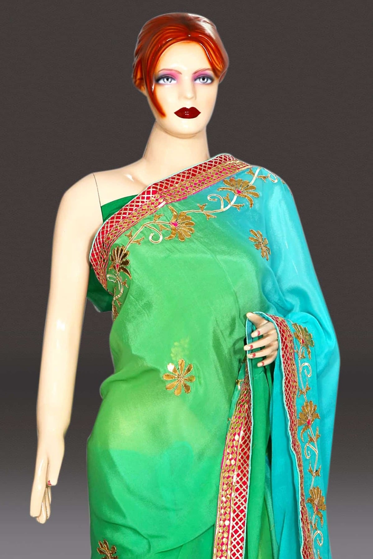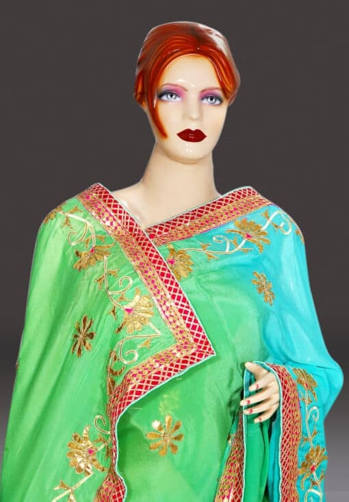 This dual shaded blue, green rajasthani heavy work designer Saree will enhance your charm when you wear it. This designer wedding saree is made of chinon fabric with handmade gota Patti work all over. This beautiful saree has a matching unstitched blouse.
