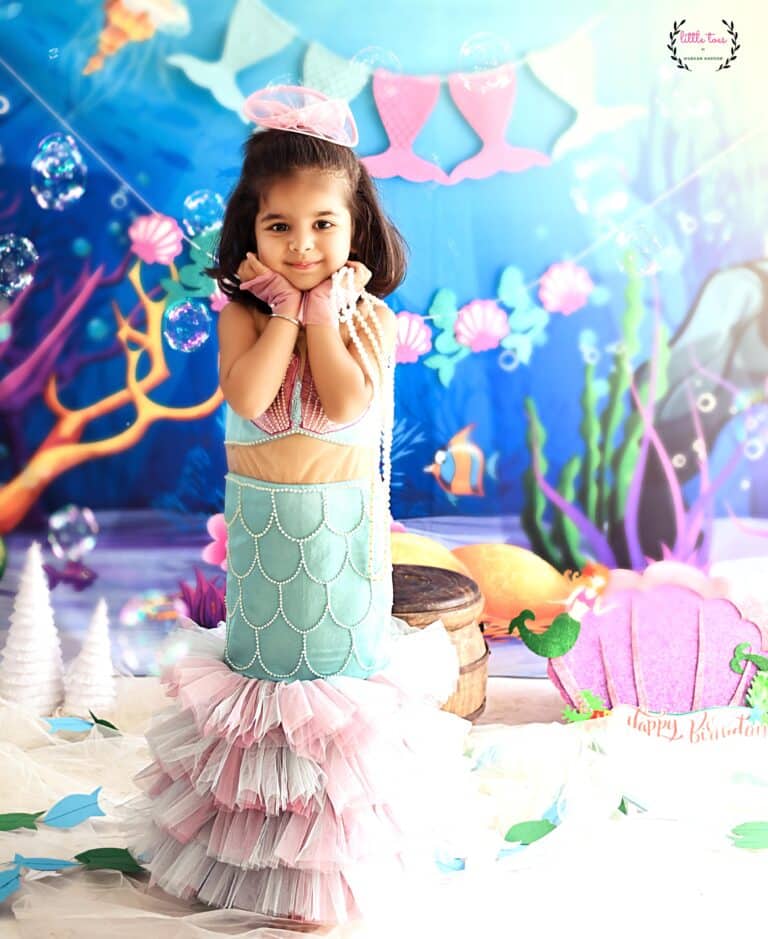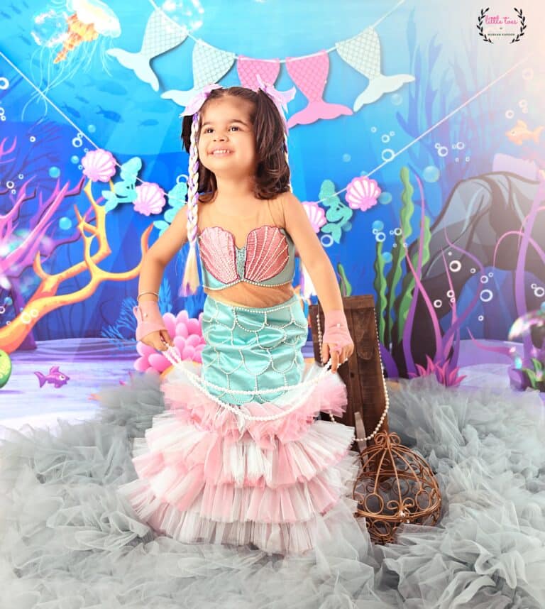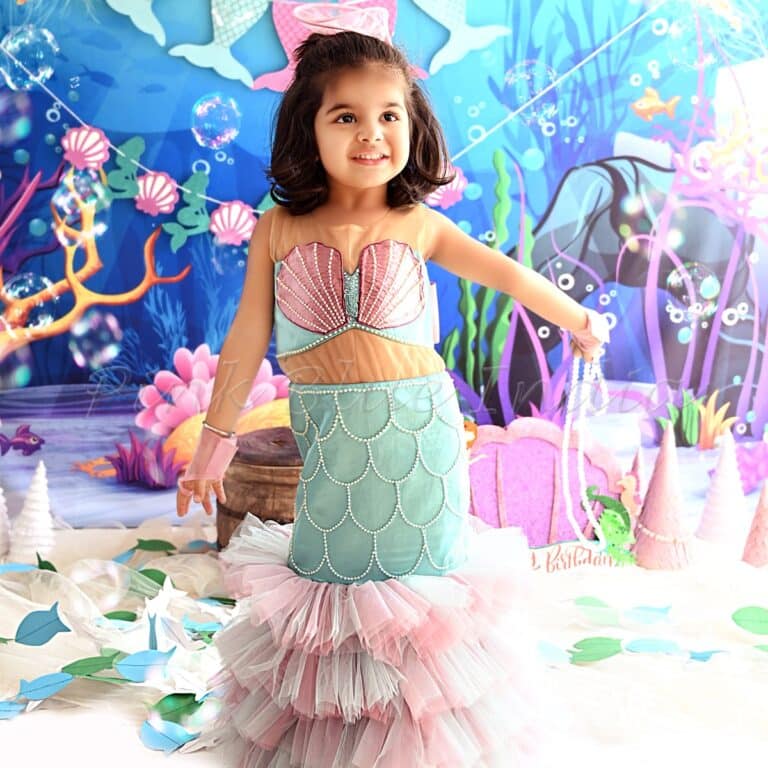 Mermaid one piece Costumes with pearls for girls of All Ages. Dive into the latest trends and find the perfect Mermaid theme dress for your daughter’s birthday customised for perfect fittings.