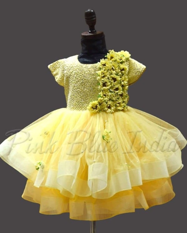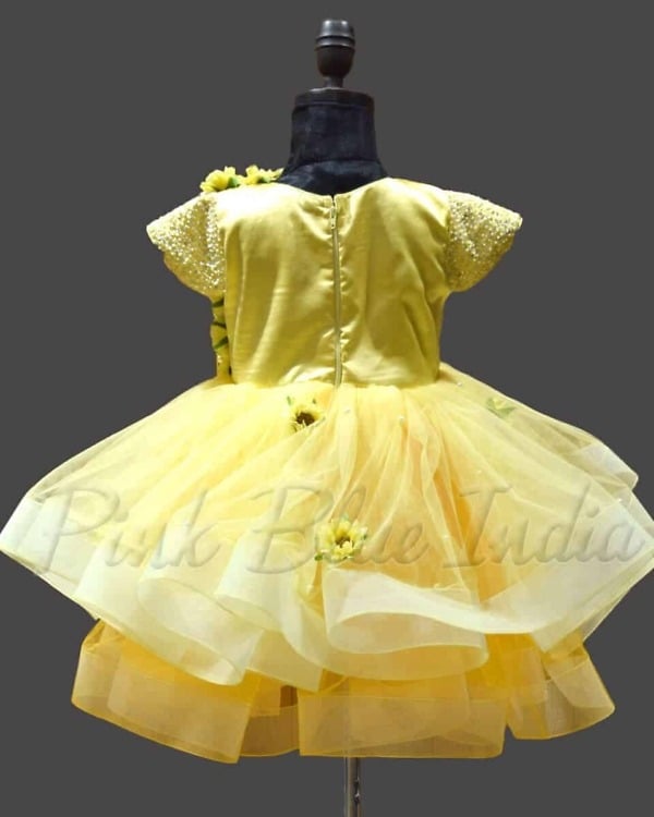 Make her birthday party celebrations and wedding parties all the more gorgeous with this bright and pretty sunflower theme gown in yellow color. Made using premium net fabric, this first birthday sunflower dress has beautiful handwork with stones on the yoke. The sunflower outfit for 1 year old has layered flare that adds on to the volume of this outfit. The lovely girls sunflower dress comes with a matching headband to make sure that your darling looks amazing.